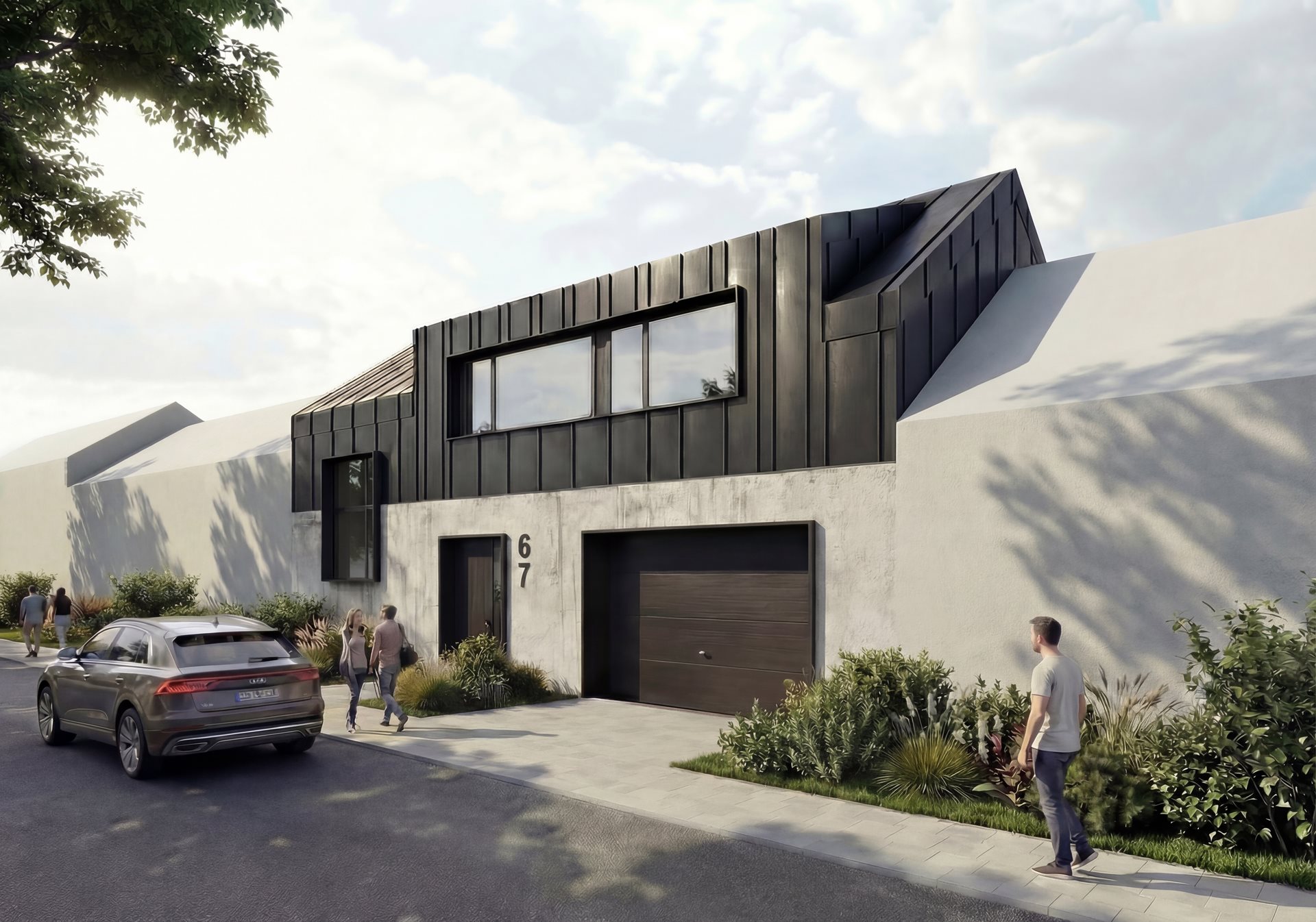 Tento řadový dům má moderní vzhled s čistými liniemi a jednoduchou hmotou. Přízemí tvoří světlá betonová fasáda s nenápadným vstupem a garážovými vraty. Horní část domu je výraznější – je obložena tmavým falcovaným plechem a má dynamicky tvarovanou střechu. Velké horizontální okno v patře přivádí do interiéru dostatek světla. Celkový dojem doplňuje uklizený chodník a zeleň podél fasády, které stavbě dodávají příjemnější městský charakter.